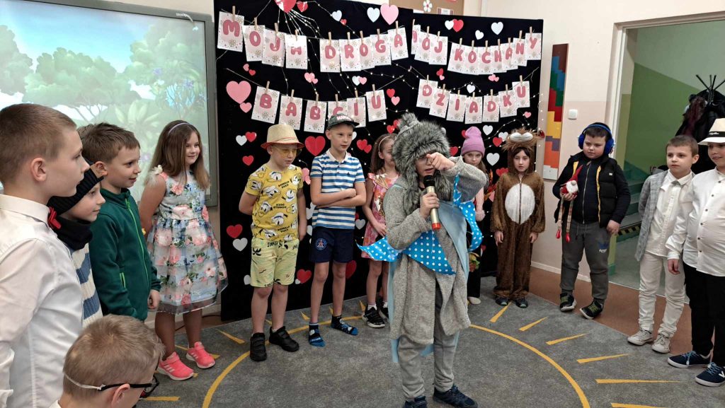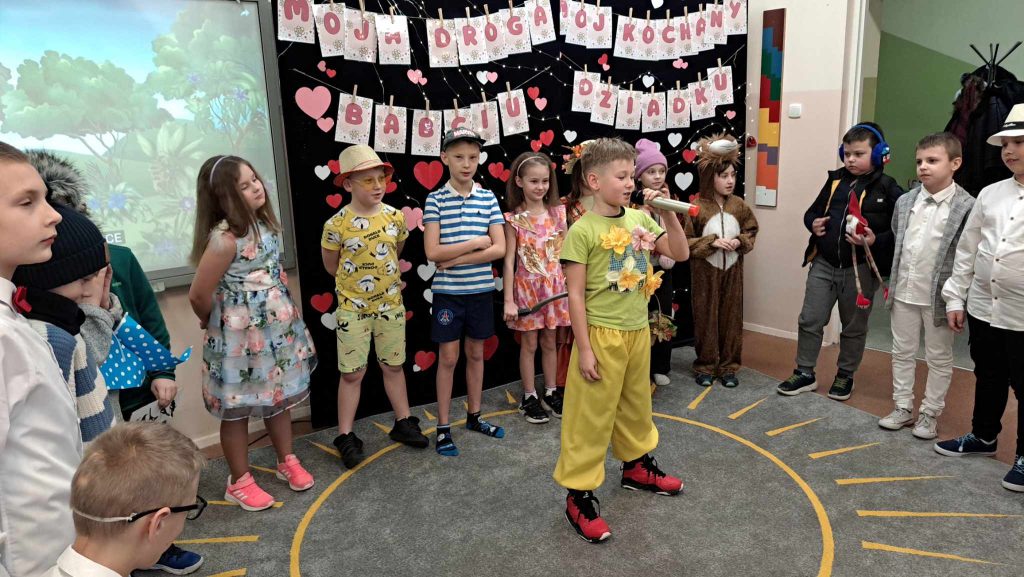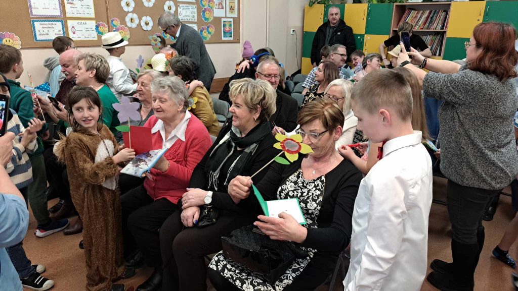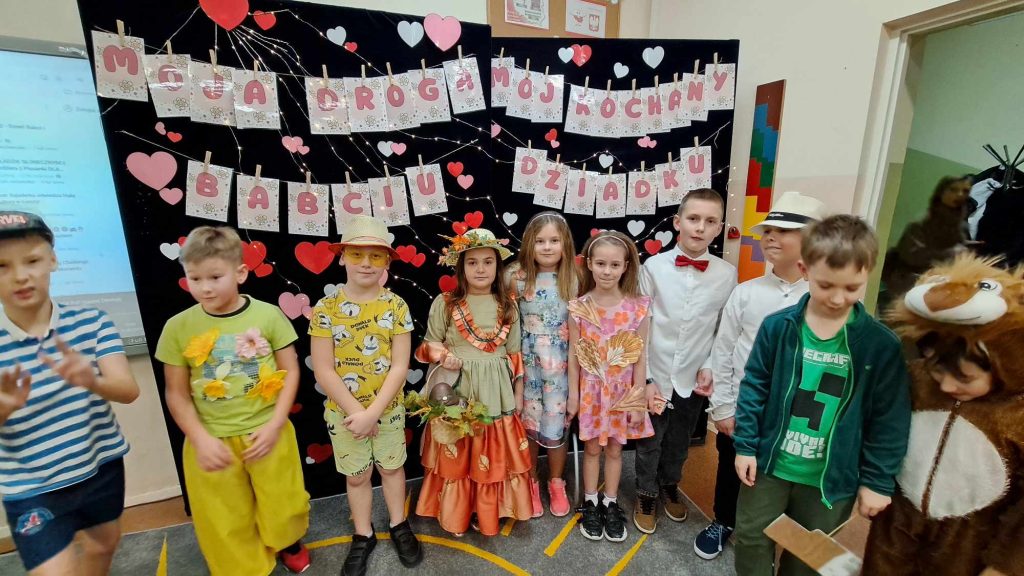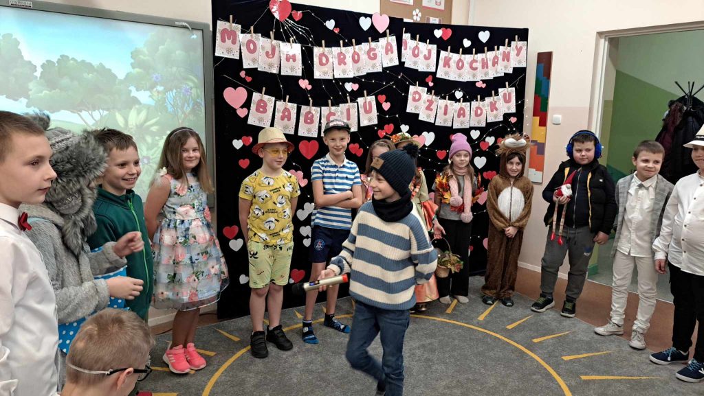 Dzisiejszy dzień w naszej szkole był pełen wzruszeń i radości, ponieważ klasa IIb pod czujnym okiem wychowawcy zorganizowała przedstawienie z okazji Dnia Babci i Dziadka. Na widowni zasiedli dumni dziadkowie i babcie gotowi do oklasków 😉 Dzieci złożyły serdeczne życzenia. Nie zapomniały życzyć wysokiej emerytury dla dziadków, pragnąc, aby każda chwila była dla nich radosna i pełna spokoju. Nie obyło się bez łez wzruszenia. Dodatkową atrakcją występu był konkurs, w którym babcie i dziadkowie odgadywali swoje portrety narysowane przez dzieci. To zadanie dostarczyło wielu śmiechu i radości zarówno dzieciom, jak i dorosłym. Na zakończenie wnuczęta wręczyły swoim gościom własnoręcznie wykonane laurki oraz zaprosiły na słodki poczęstunek. Serdecznie dziękujemy rodzicom za pomoc w przygotowaniu tej uroczystości i za ich ogromne zaangażowanie w organizację dzisiejszego wydarzenia.