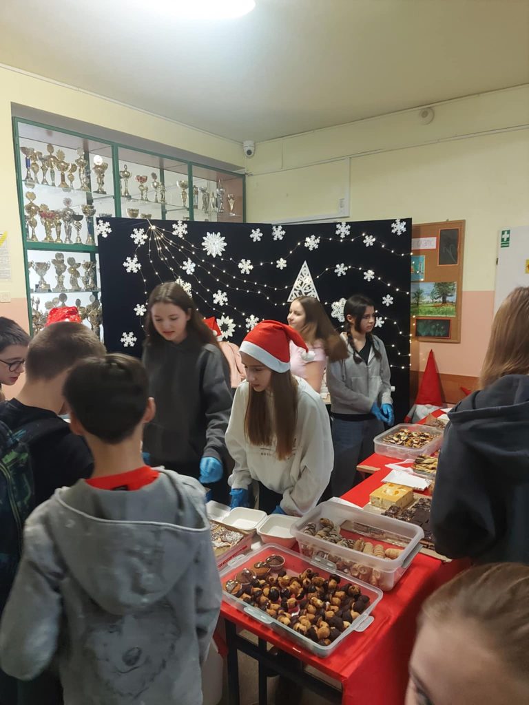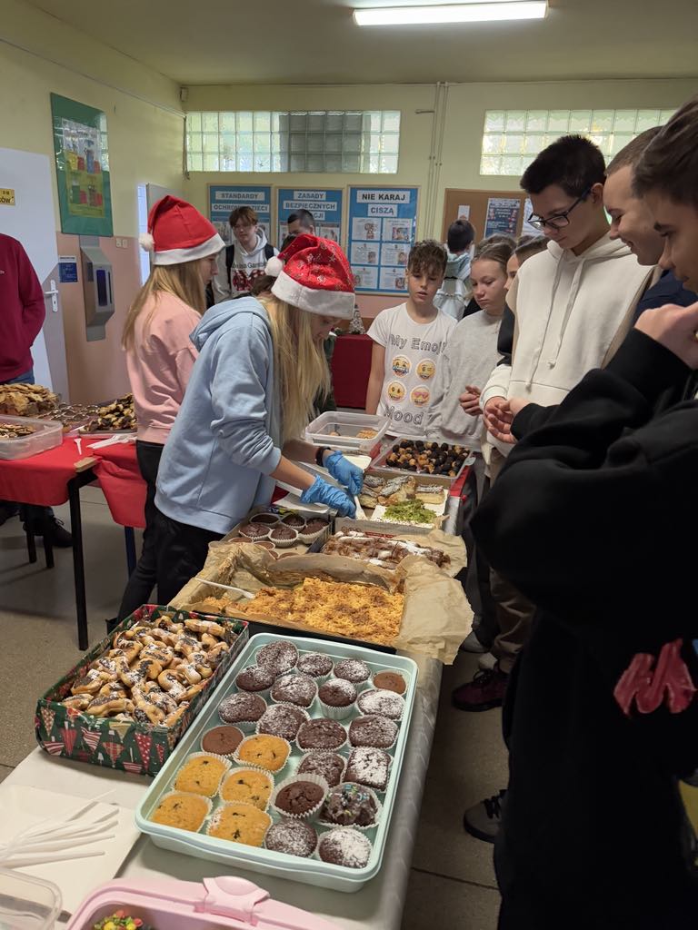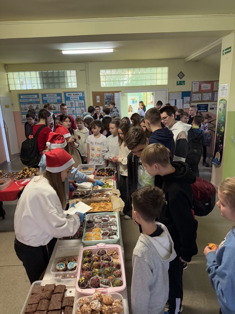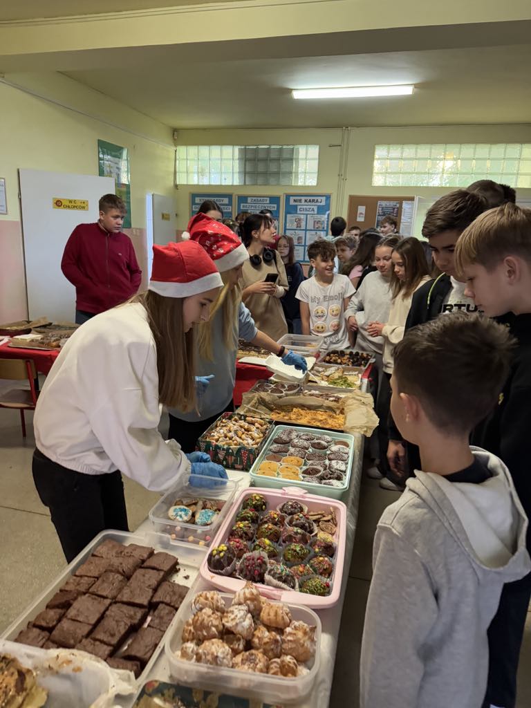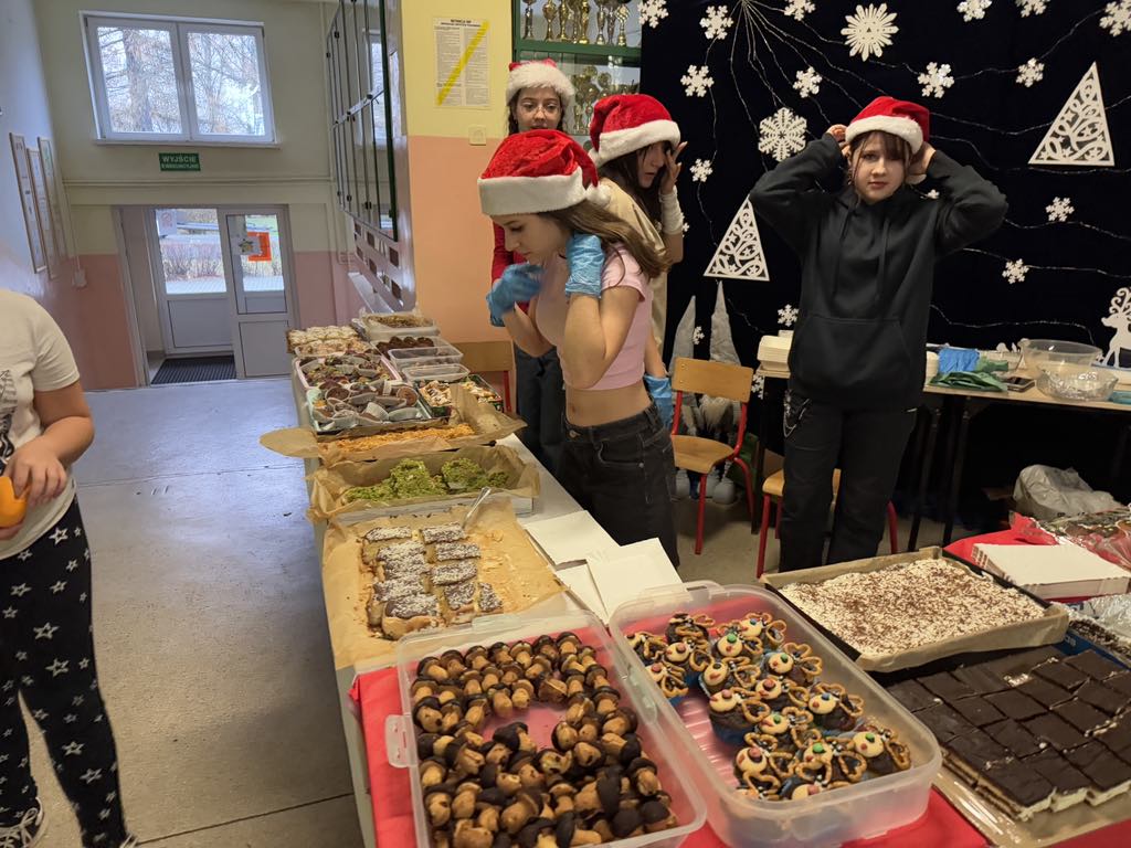 Podczas kiermaszu można było zakupić ciasta, babeczki, pierniczki oraz inne przepyszne wypieki, które sprzedawane były przez uczniów ze Szkolnego Koła Wolontariatu. Dzięki ich zaangażowaniu i pracy, kiermasz cieszył się dużym zainteresowaniem, a zebrane fundusze na pewno przyczynią się do poprawy warunków w naszej szkole.