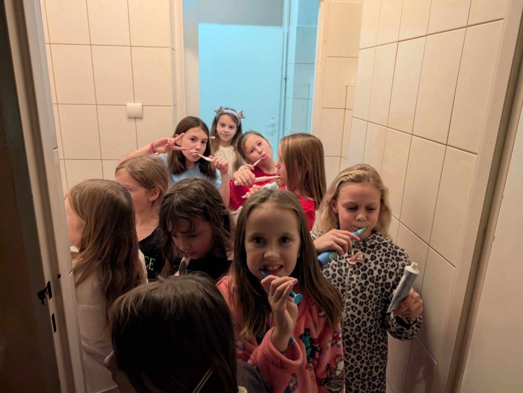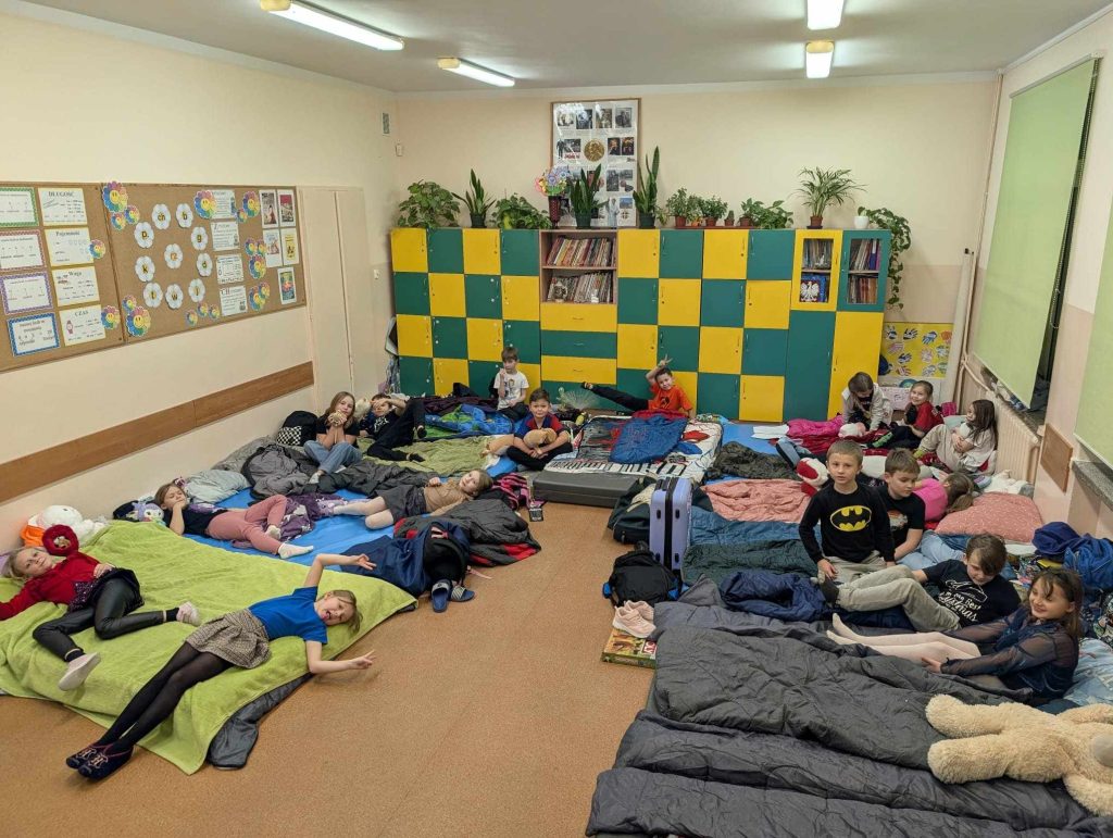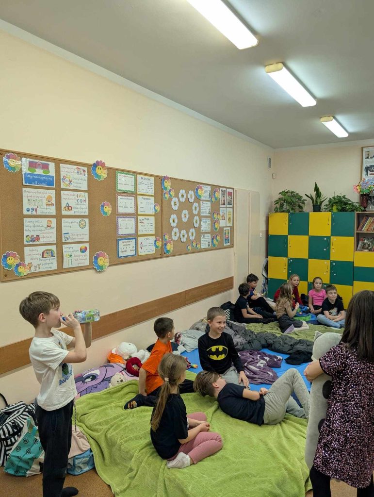 Uczniowie z klasy II a z pewnością na długo zapamiętają noc z piątku na sobotę. Noc w szkole była świetną okazją do integracji uczniów, kształtowania umiejętności współdziałania i pracy w zespołach. Mnóstwo frajdy sprawiło dzieciom rozkładanie śpiworów. Po wspólnym przygotowaniu do nocowanki i zjedzeniu pizzy 🍕, przyszedł czas na wspólną zabawę – dzieci miały grupową grę terenową, zwiedzili szkołę z latarkami, potańczyli na disco oraz obejrzeli wspólnie film. Później przyszedł czas na rozmowy i spanie. Rano dzień rozpoczęli rozruchem na sali. Po śniadaniu zmęczeni i zadowoleni wrócili do domu. Dla niektórych była to pierwsza w życiu noc poza domem dlatego to wydarzenie było pełne niesamowitych emocji.