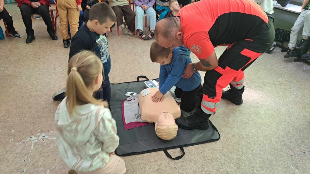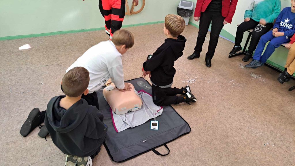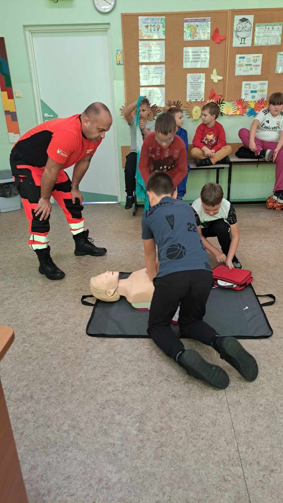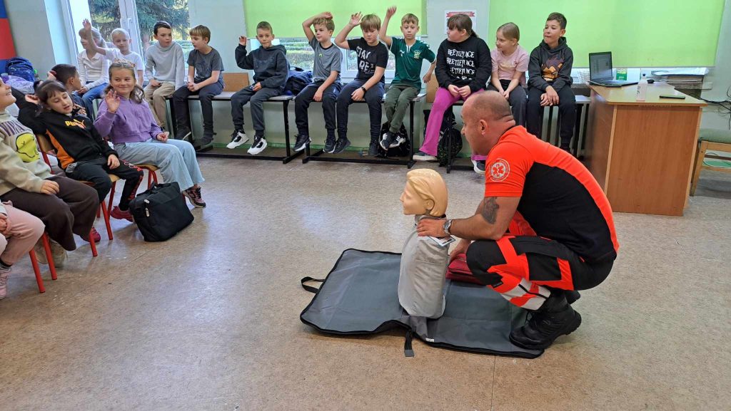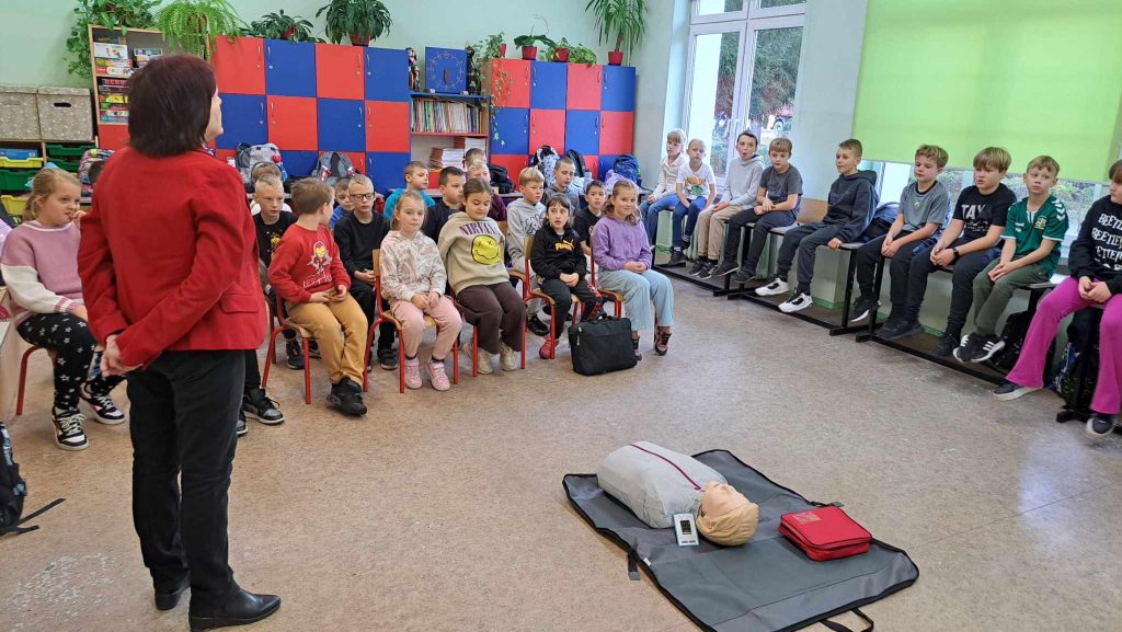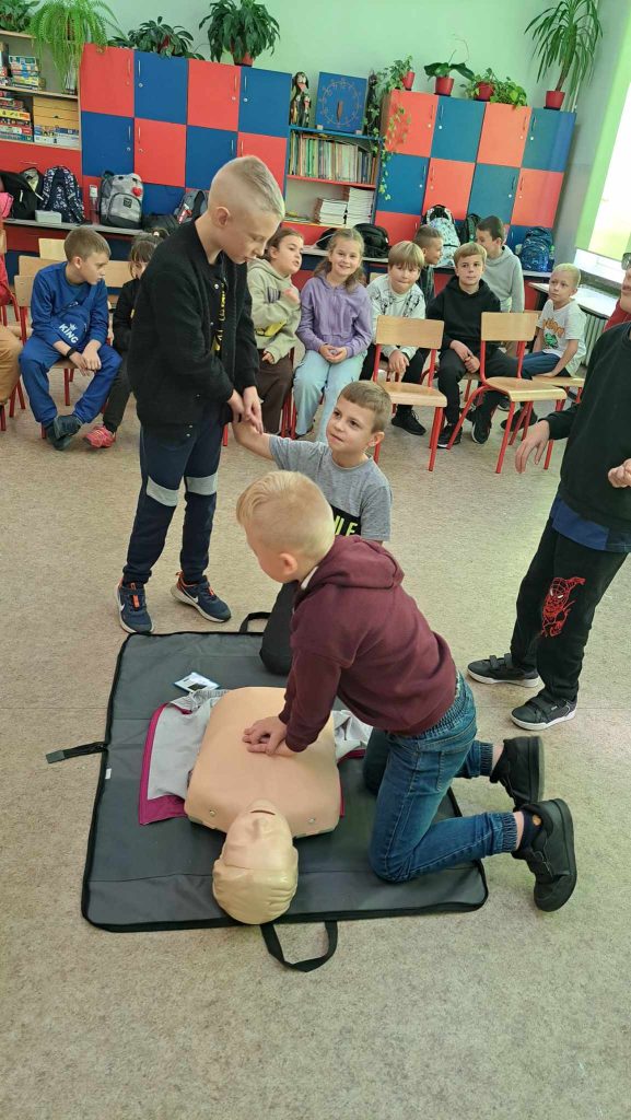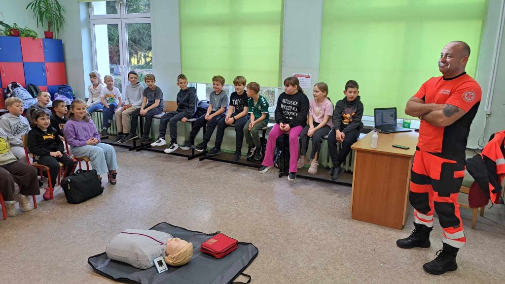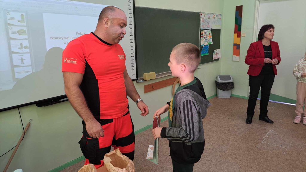 17.10.2024r. naszą szkołę odwiedził Pan Karol Krajewski- ratownik medyczny pracujący w Szpitalu Powiatowym im. Jana Pawła II w Bartoszycach. Pan Karol Krajewski przeprowadził niezwykle interesujące zajęcia z zakresu udzielania pierwszej pomocy. Uczniowie klas IIb i IIIb z zainteresowaniem śledzili scenki sytuacyjne przedstawiające zasady postępowania i kolejność czynności w trakcie resuscytacji krążeniowo-oddechowej. Dzieci miały okazję nie tylko obserwować, ale także same uczestniczyć w ćwiczeniach praktycznych, co wzbudziło w nich jeszcze większe zaangażowanie. W trakcie zajęć każdy z uczestników miał możliwość zadawania pytań a Pan Karol chętnie na nie odpowiadał, dzieląc się swoją wiedzą i doświadczeniem. Spotkanie wzbogaciły ciekawe anegdoty z życia ratownika, które pokazały, jak ważna i odpowiedzialna jest jego praca. Na zakończenie, uczniowie otrzymali od ratownika słodkie cukierki jako nagrodę za ich wysiłek.