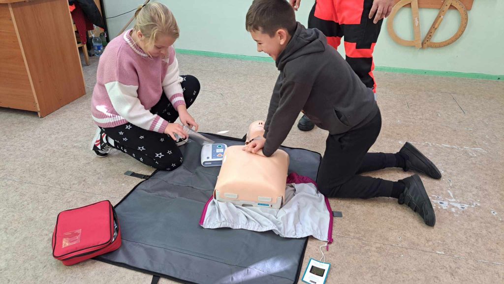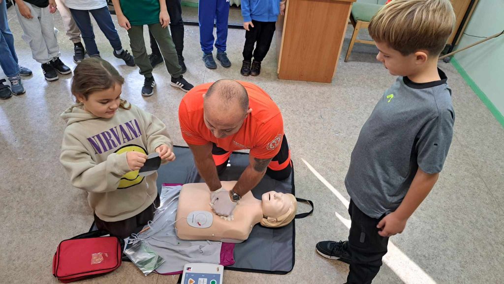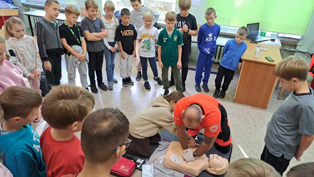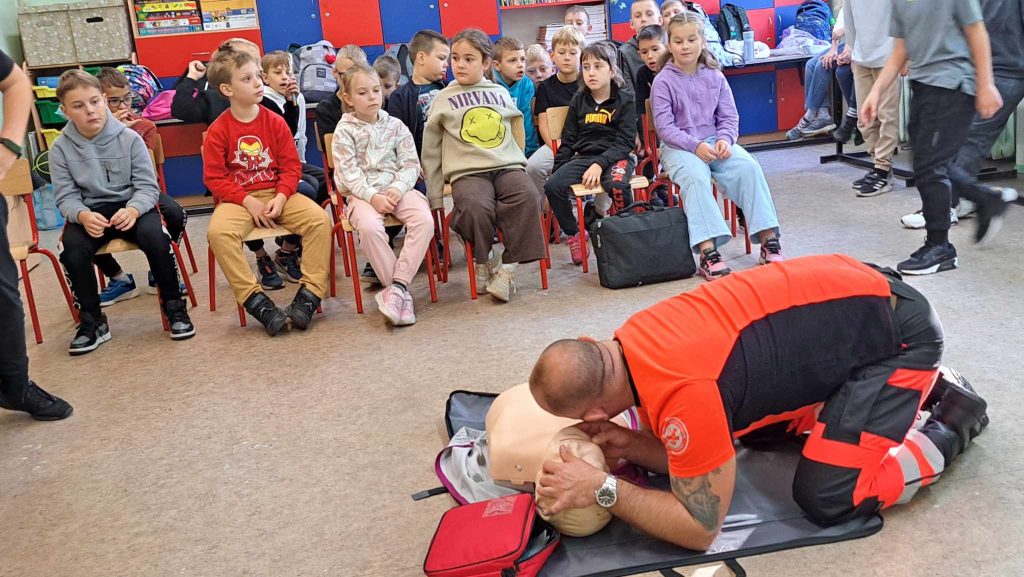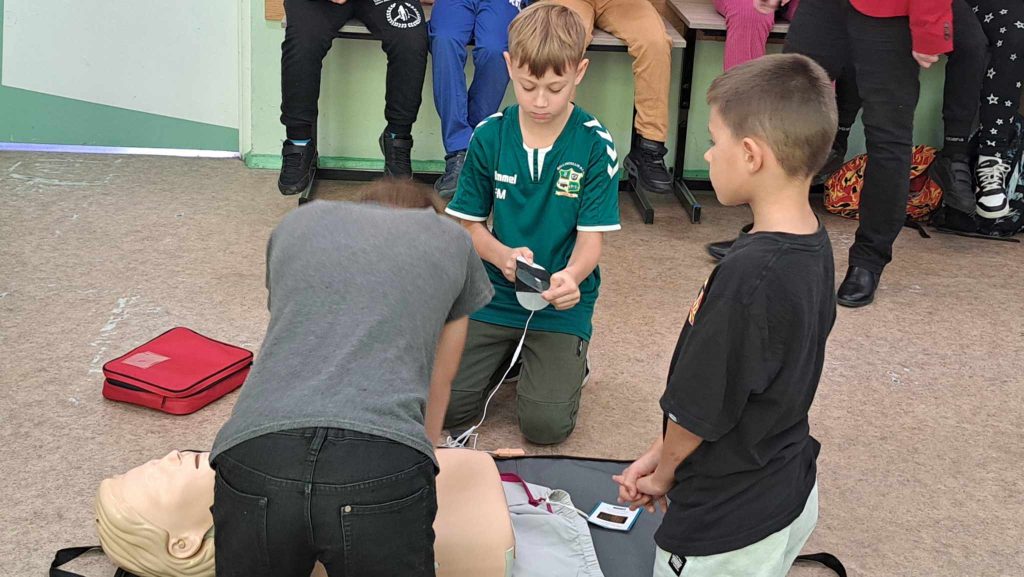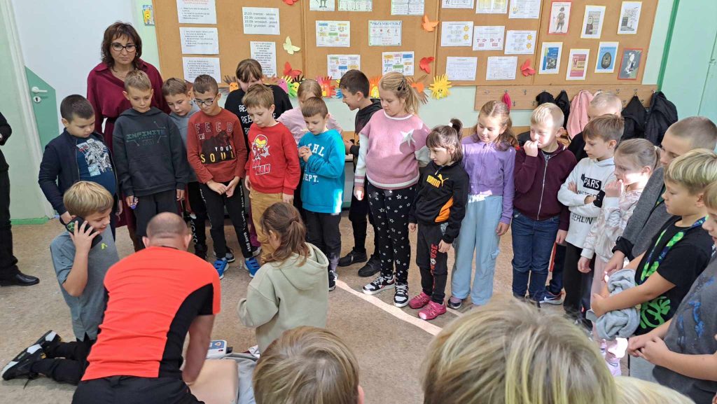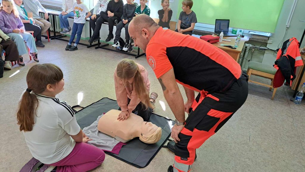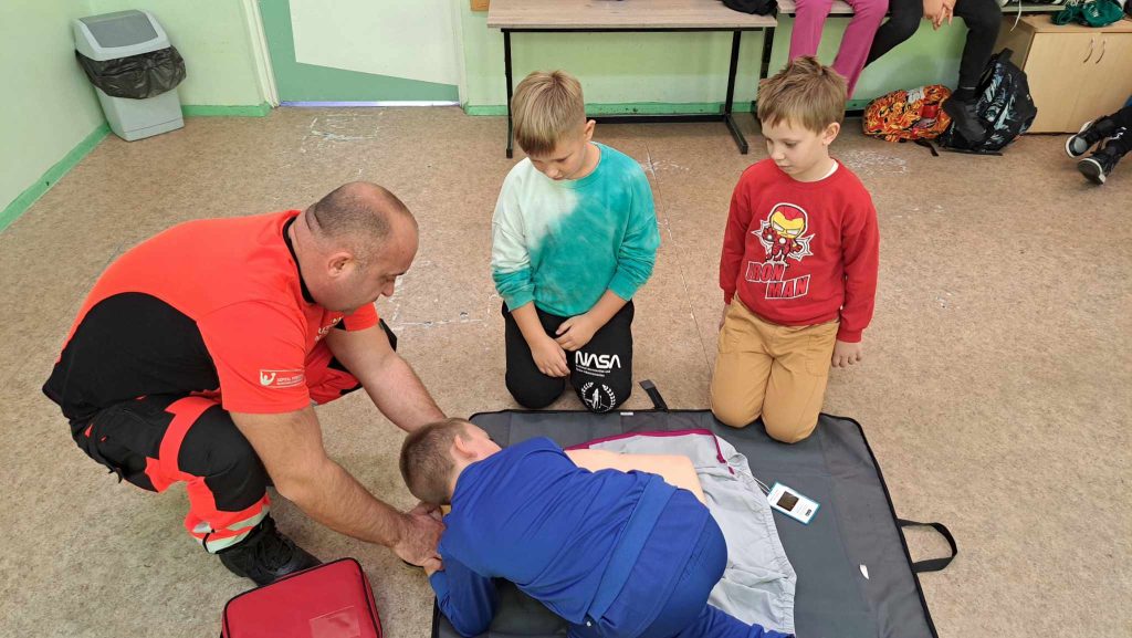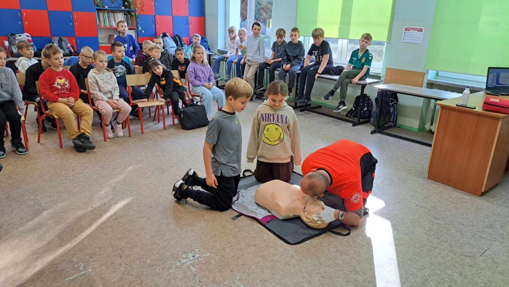 17.10.2024r. naszą szkołę odwiedził Pan Karol Krajewski- ratownik medyczny pracujący w Szpitalu Powiatowym im. Jana Pawła II w Bartoszycach. Pan Karol Krajewski przeprowadził niezwykle interesujące zajęcia z zakresu udzielania pierwszej pomocy. Uczniowie klas IIb i IIIb z zainteresowaniem śledzili scenki sytuacyjne przedstawiające zasady postępowania i kolejność czynności w trakcie resuscytacji krążeniowo-oddechowej. Dzieci miały okazję nie tylko obserwować, ale także same uczestniczyć w ćwiczeniach praktycznych, co wzbudziło w nich jeszcze większe zaangażowanie. W trakcie zajęć każdy z uczestników miał możliwość zadawania pytań a Pan Karol chętnie na nie odpowiadał, dzieląc się swoją wiedzą i doświadczeniem. Spotkanie wzbogaciły ciekawe anegdoty z życia ratownika, które pokazały, jak ważna i odpowiedzialna jest jego praca. Na zakończenie, uczniowie otrzymali od ratownika słodkie cukierki jako nagrodę za ich wysiłek.
