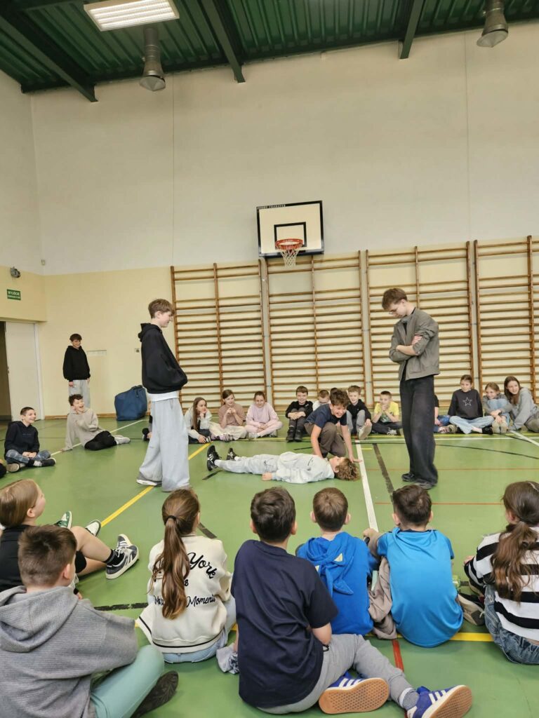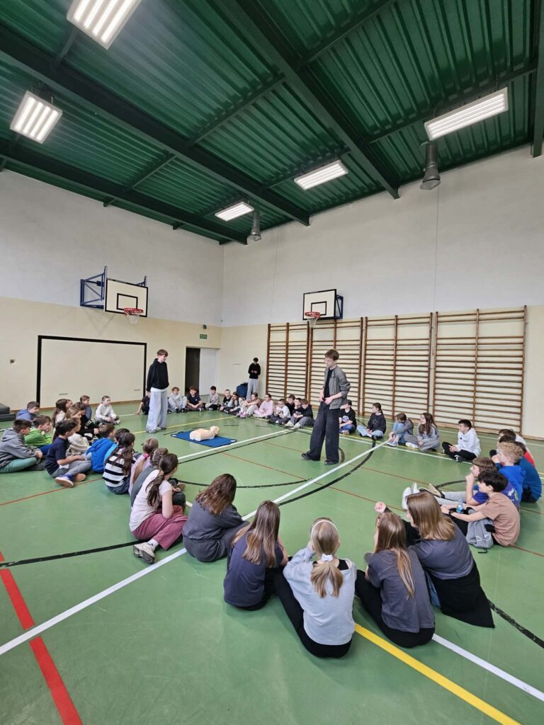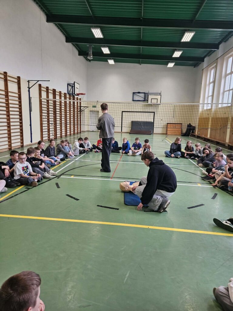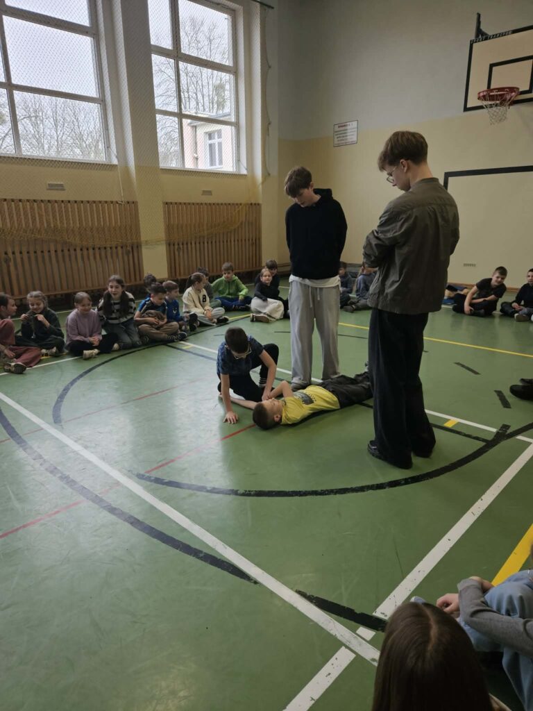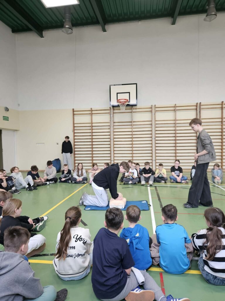 Dnia 16 marca uczniowie klas 3 i 4 wzięli udział w pokazie pierwszej pomocy. Podczas zajęć poznali zasady resuscytacji krążeniowo-oddechowej (RKO) oraz uczyli się układania poszkodowanego w pozycji bocznej bezpiecznej. Uczniowie z dużym zaangażowaniem i zainteresowaniem uczestniczyli w zajęciach, chętnie biorąc udział w ćwiczeniach praktycznych.