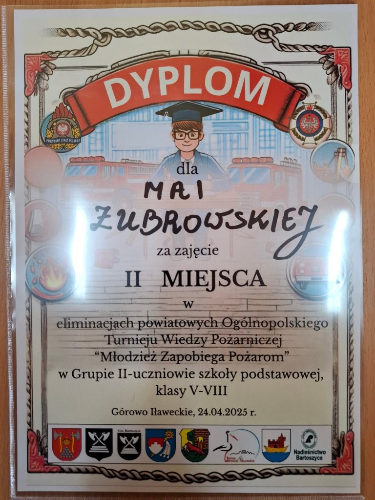 II miejsce  zdobyła Maja Żubrowska  (kl.7A). Eliminacje powiatowe  odbyły się 24.04.2025 r. w Górowie Iławeckim. Uczestniczyli w nich laureaci etapu  miejsko-gminnego.