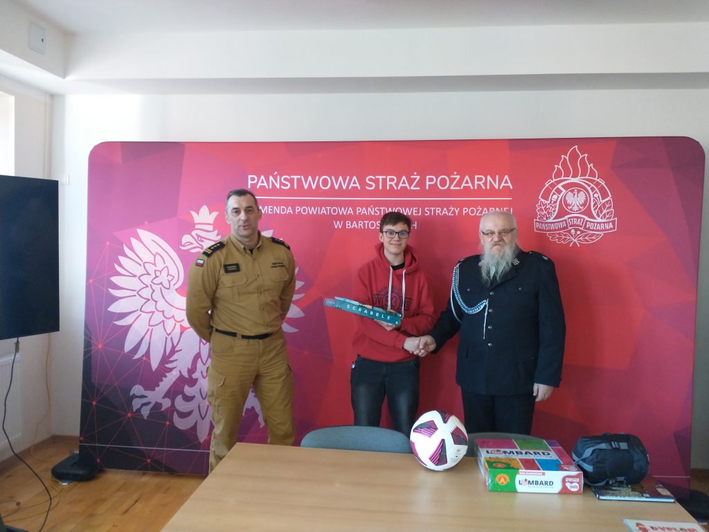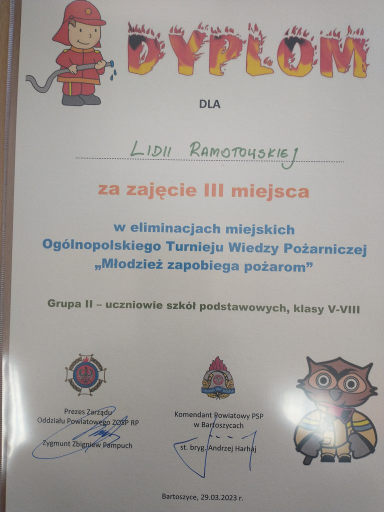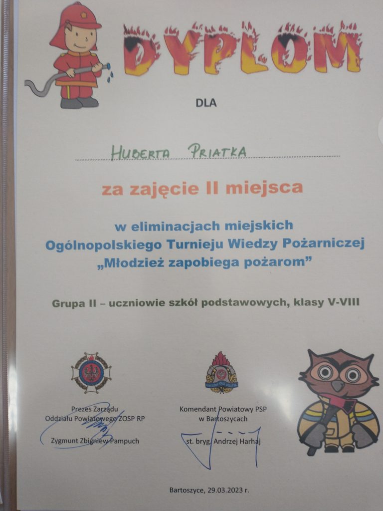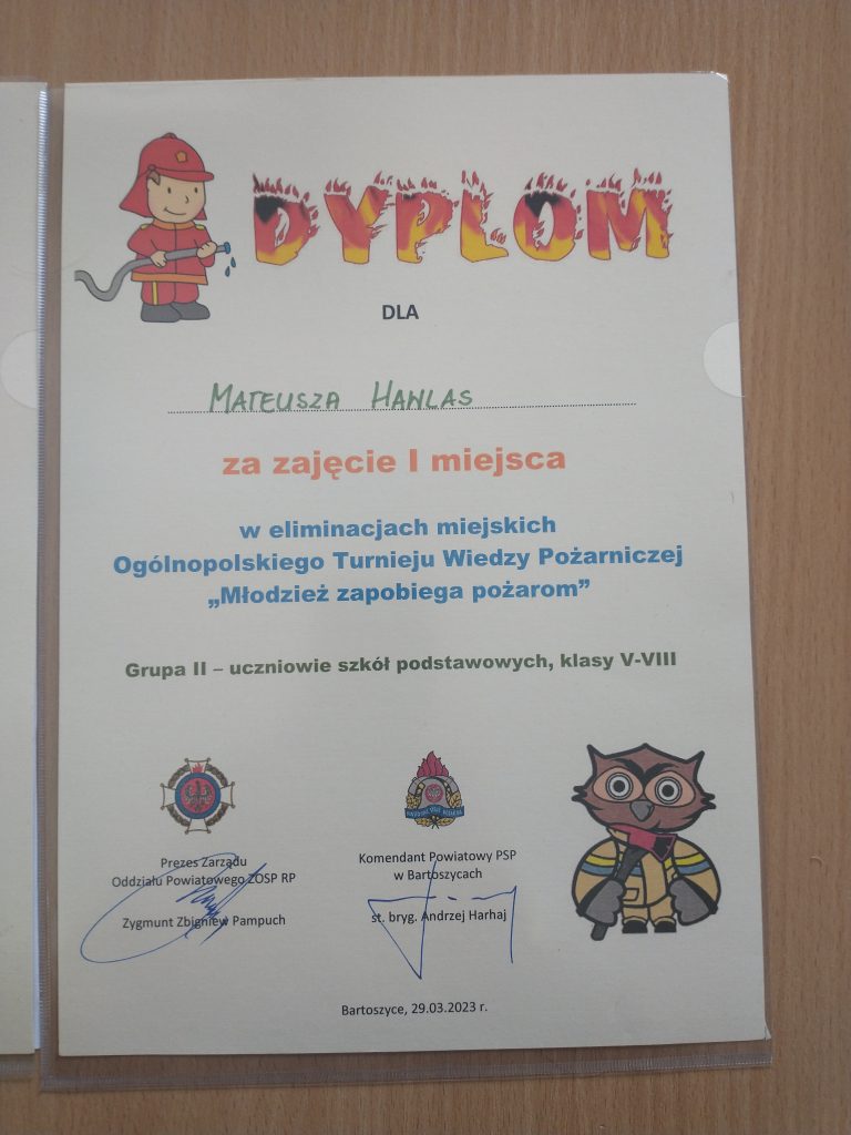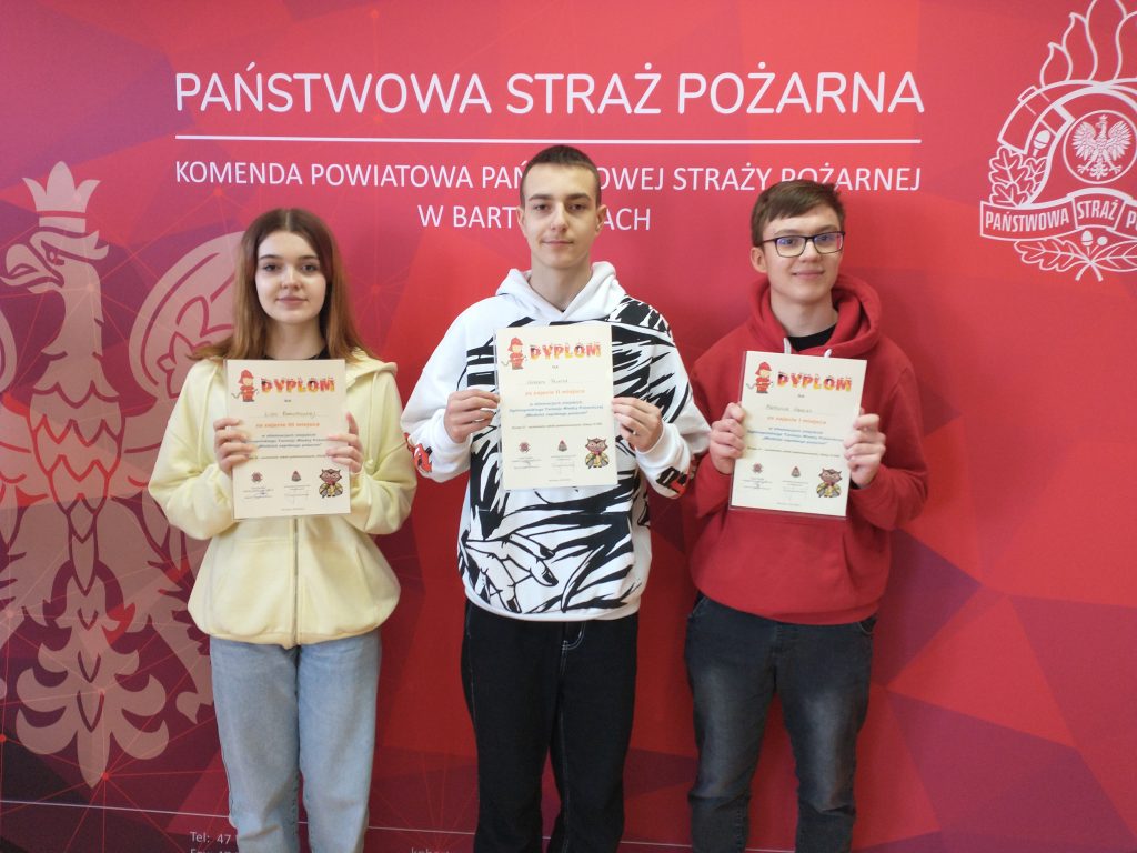 I miejsce zdobył Mateusz Hawłas, II miejsce Hubert Priatka , III miejsce Lidia Ramotowska. Uczniowie zakwalifikowali się do kolejnego etapu. Eliminacje odbyły się 29 marca 2023 r. w Komendzie Powiatowej Państwowej Straży Pożarnej w Bartoszycach. Uczniów przygotowywał: Jarosław Puszko.