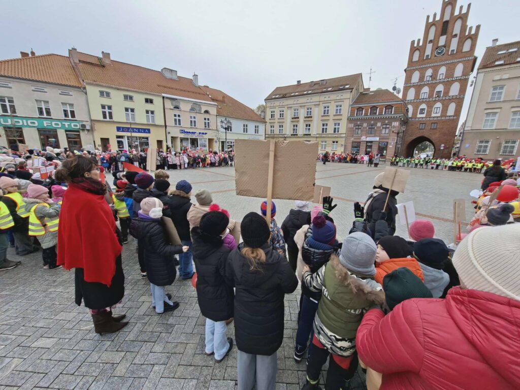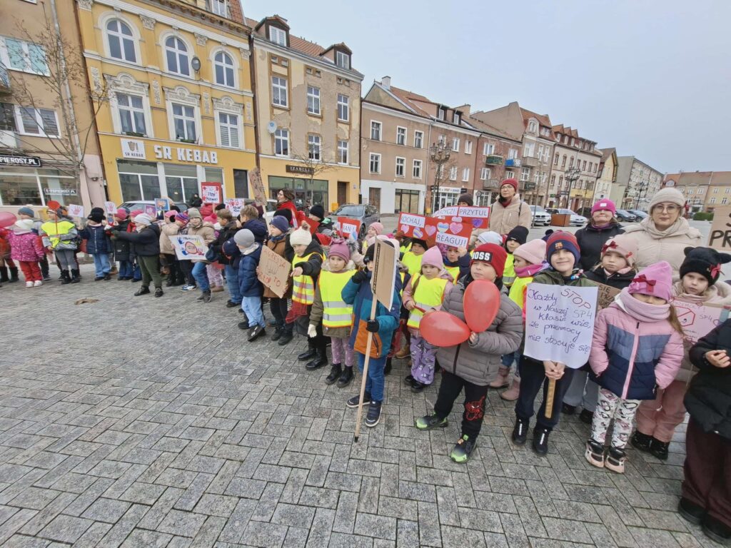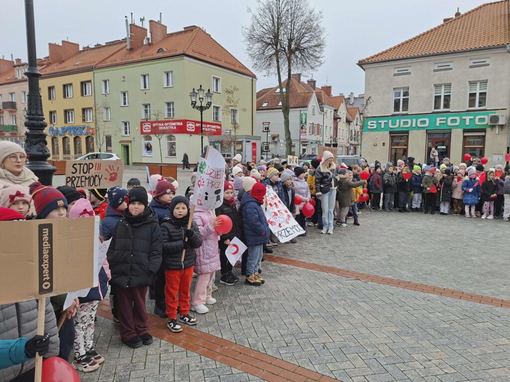Uczniowie nieśli własnoręcznie przygotowane transparenty i plakaty z hasłami, a w dłoniach trzymali czerwone baloniki – kolor czerwony symbolizuje sprzeciw wobec przemocy i przypomina o potrzebie ochrony dzieciństwa.