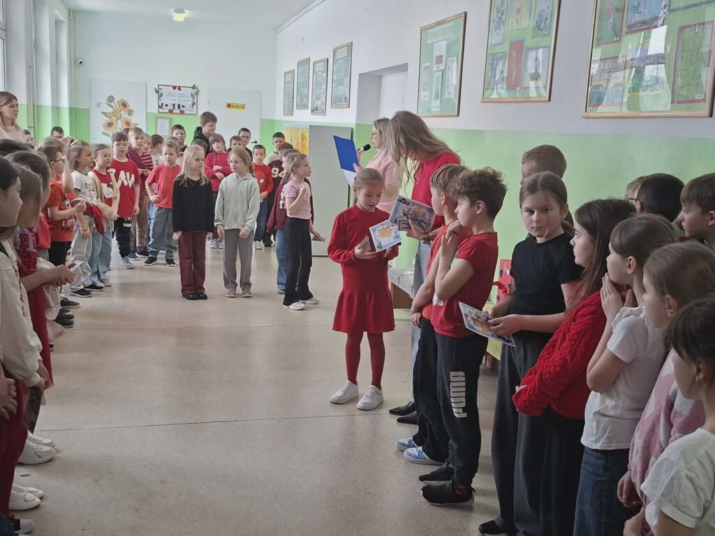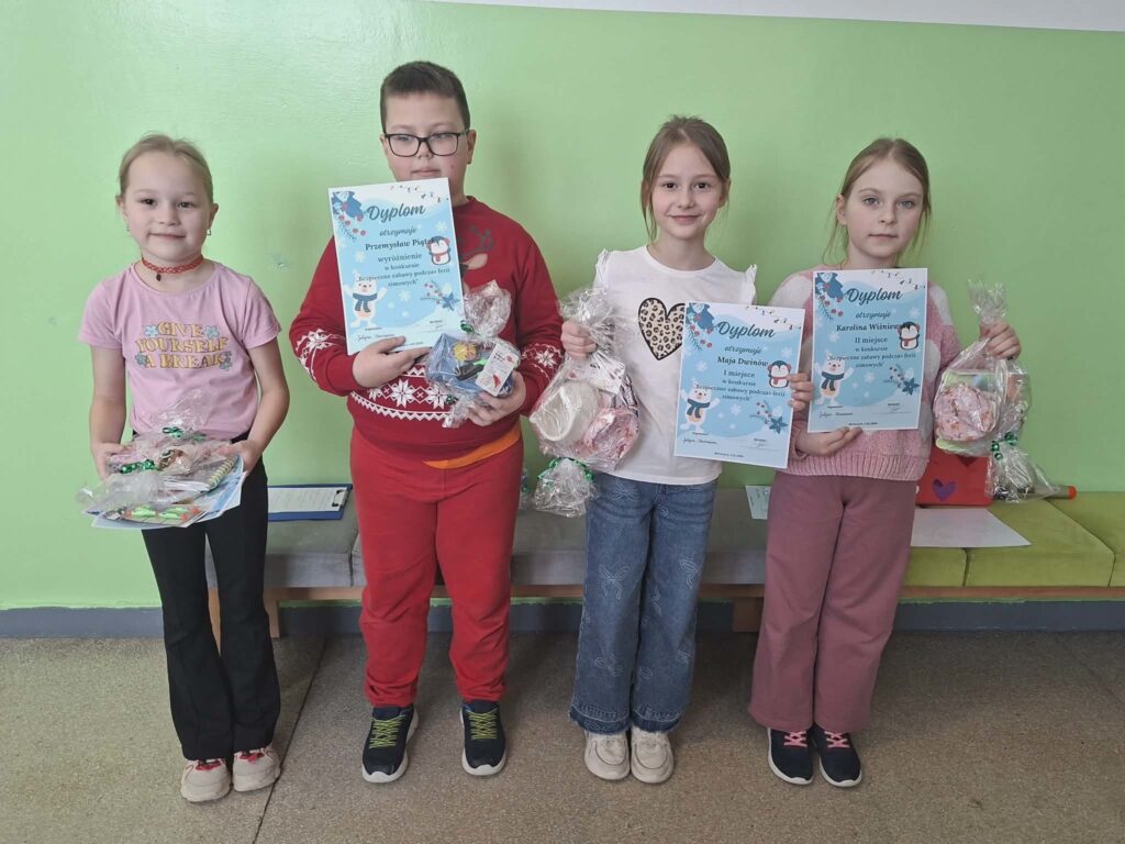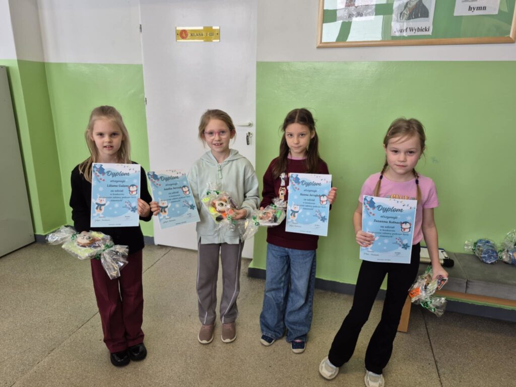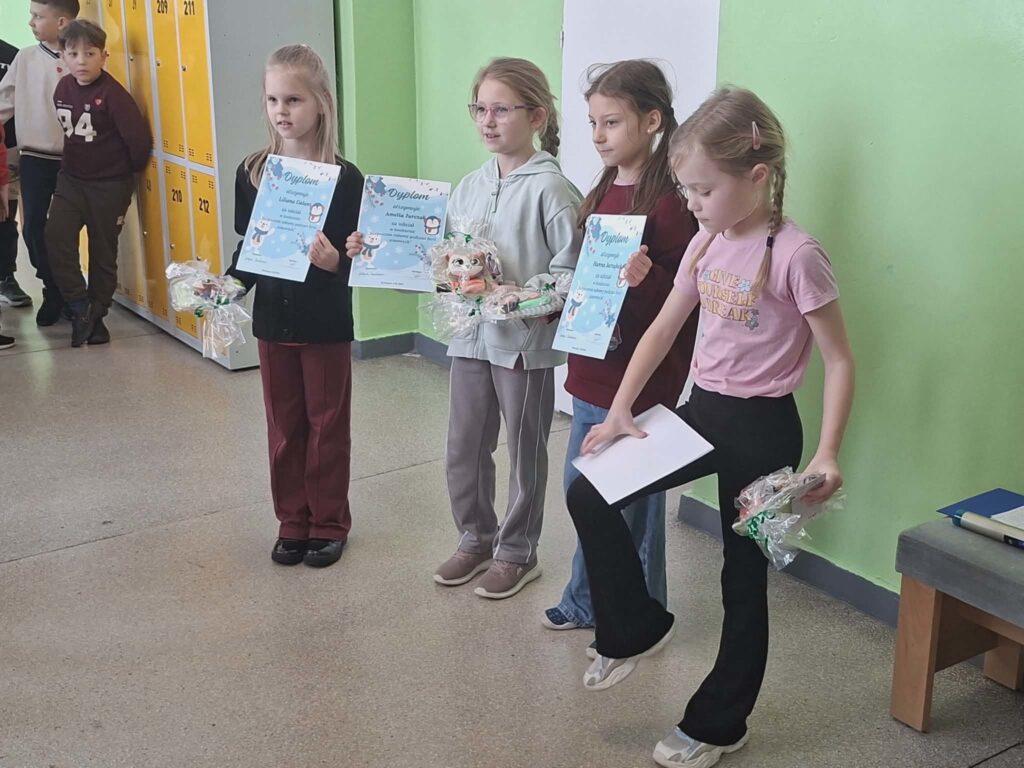 Podczas apelu nagrodzono laureatów konkursu plastycznego „Bezpieczne zabawy podczas ferii zimowych”, zorganizowanego przez panią Justynę, oraz zwycięzców konkursu na najładniej prowadzony zeszyt, przygotowanego przez Mały Samorząd Szkolny pod opieką pani Sandry.