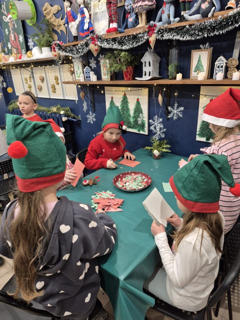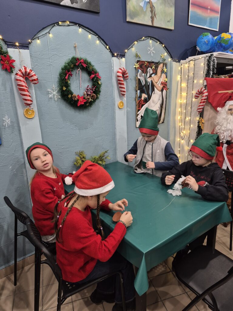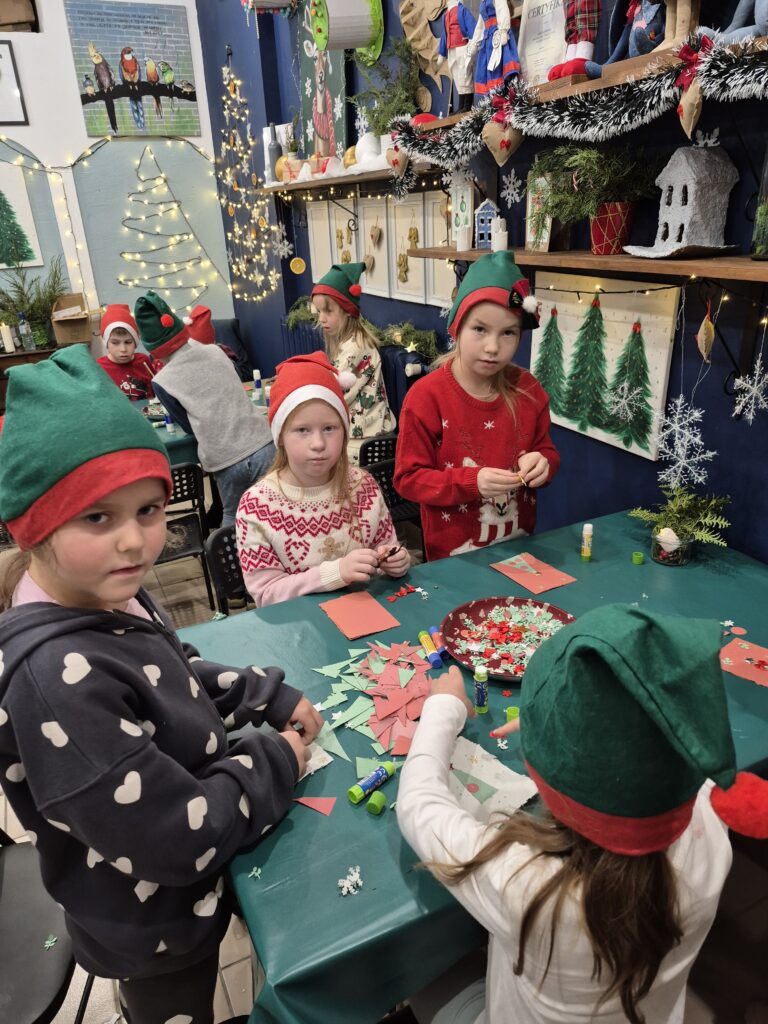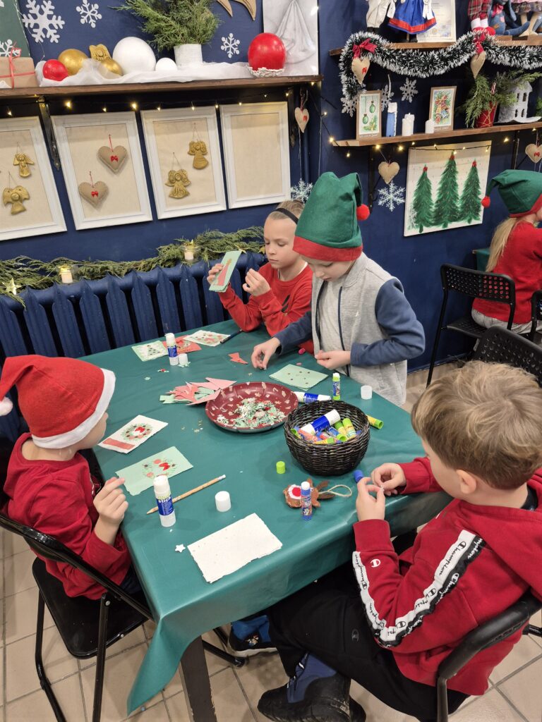 Uczniowie klasy 1a wzięli udział w warsztatach świątecznych, podczas których panowała twórcza i radosna atmosfera. W ramach zajęć dzieci uszyły z filcu ozdoby choinkowe, wymagające precyzji i wyobraźni.🧶🪡 Wykonywane były również kartki świąteczne z papieru czerpanego, które następnie ozdabiane były różnorodnymi dekoracjami.