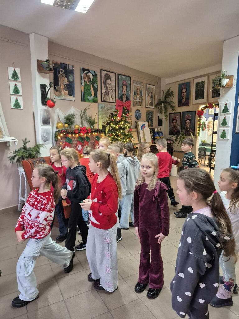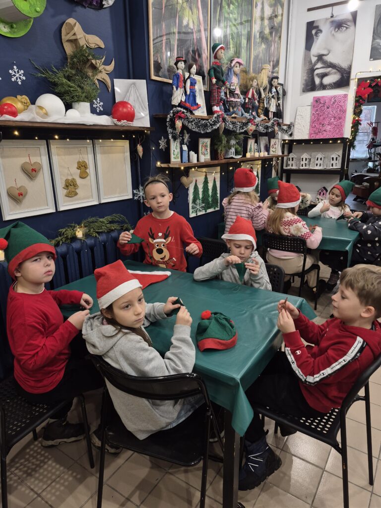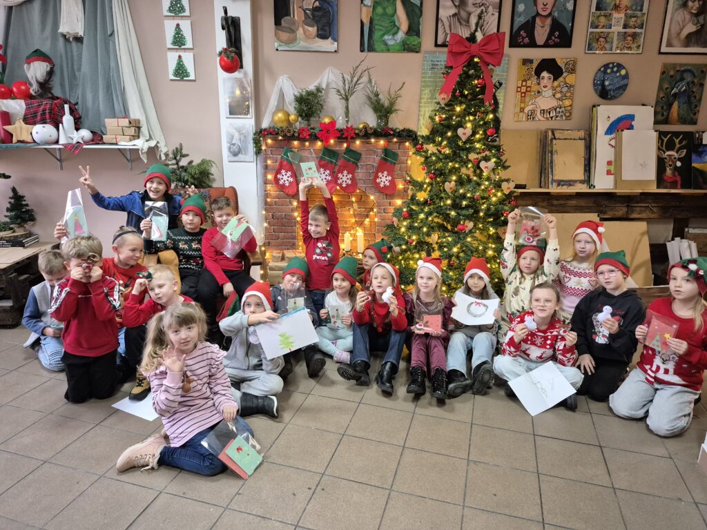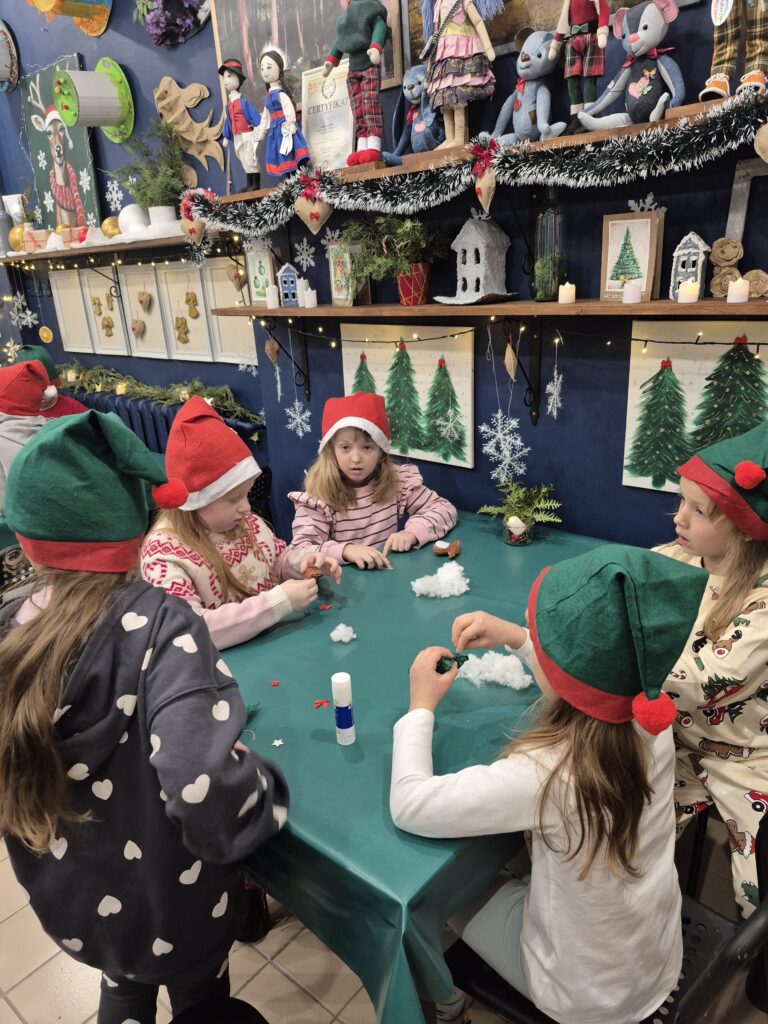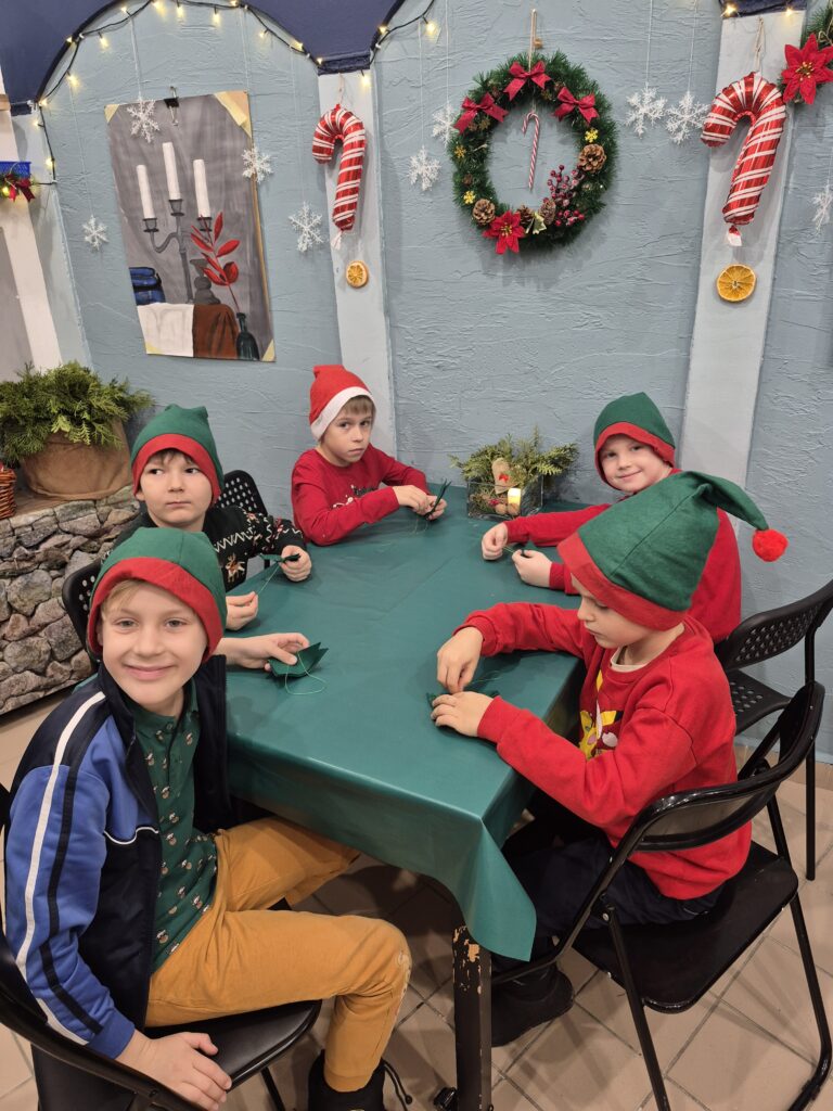 Uczniowie klasy 1a wzięli udział w warsztatach świątecznych, podczas których panowała twórcza i radosna atmosfera. W ramach zajęć dzieci uszyły z filcu ozdoby choinkowe, wymagające precyzji i wyobraźni.🧶🪡 Wykonywane były również kartki świąteczne z papieru czerpanego, które następnie ozdabiane były różnorodnymi dekoracjami.