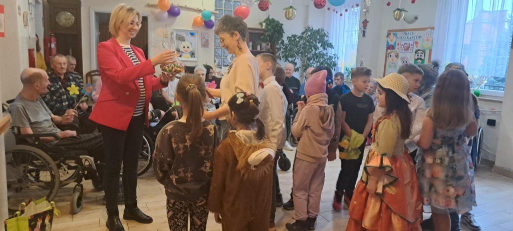 Dzieci wręczyły także własnoręcznie wykonane upominki oraz laurki, które przygotowali uczniowie naszej szkoły. Gest ten spotkał się z ogromnym uznaniem i wzruszeniem ze strony babć i dziadków. Na zakończenie pani dyrektor DPS-u wręczyła dzieciom słodkie cukierki, a wychowawca otrzymał serdeczne podziękowanie za zorganizowanie tej wizyty. To było wyjątkowe spotkanie, które na długo pozostanie w pamięci zarówno dzieci, jak i seniorów. Na pewno ponownie odwiedzimy Dom Pomocy Społecznej, aby sprawić radość seniorom i spędzić z nimi miłe chwile.