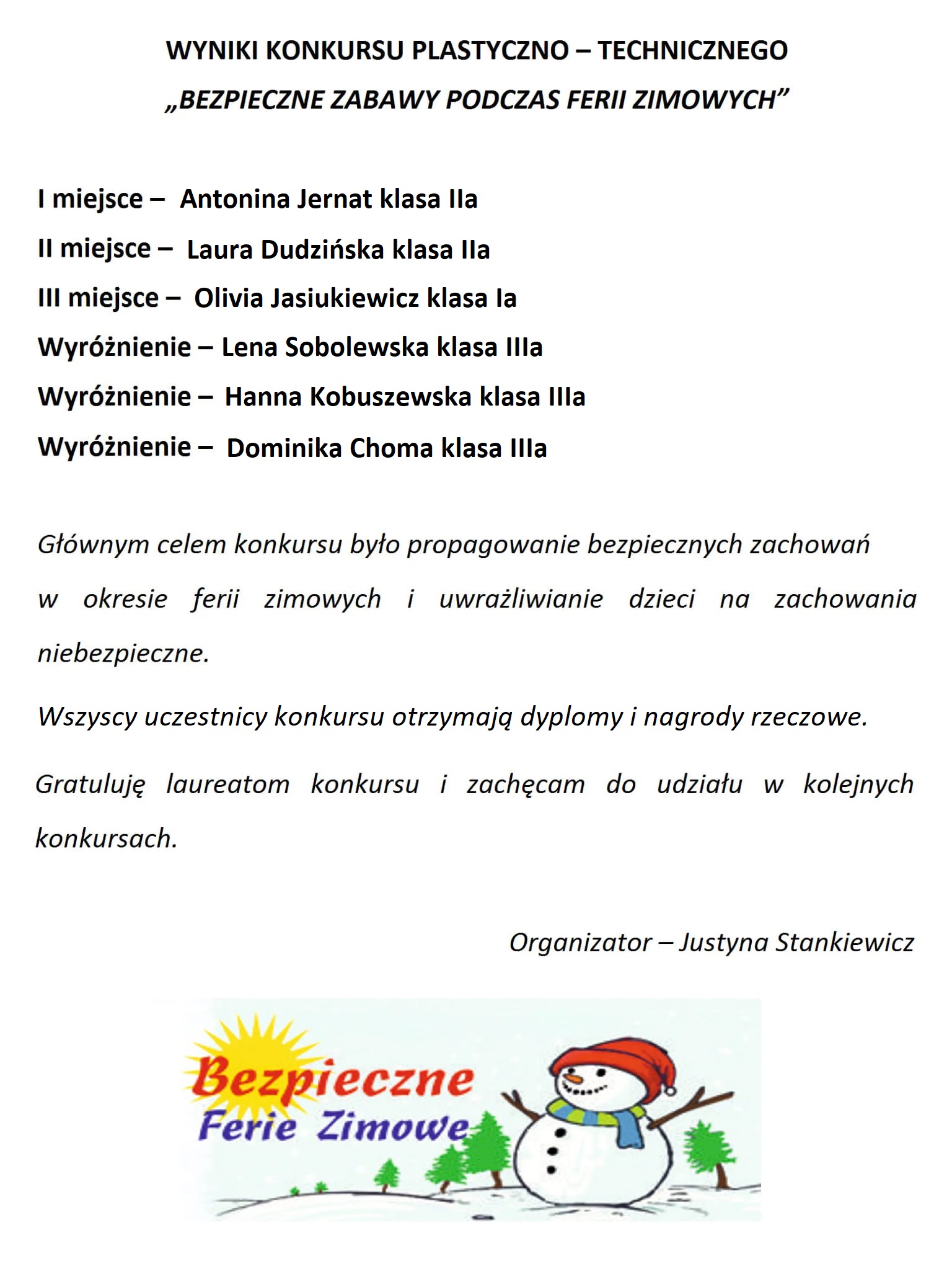 Wyniki konkursu plastyczno technicznego „Bezpieczne zabawy podczas ferii”.