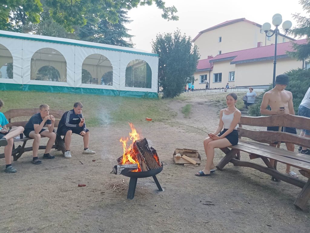 . Spragnieni przygód wybraliśmy się następnego dnia na wycieczkę pieszą do miejscowości Węgoj, gdzie spotkaliśmy postacie z legend warmińskich i poznaliśmy obyczaje ludowe. Zmęczeni pokonaną trasą ale zadowoleni rozpaliliśmy wieczorem ognisko i piekliśmy kiełbaski. Ten czas spędzony poza murami szkoły był dla nas bardzo udany. Pogoda była super, chodziliśmy na plażę, mieliśmy również czas wolny, co nam się bardzo podobało. Zrobiliśmy dużo zdjęć, jedliśmy bardzo smaczne i obfite posiłki, poznaliśmy nowych rówieśników. To była wspaniała wycieczka, nigdy nie zapomnimy czasu tam spędzonego